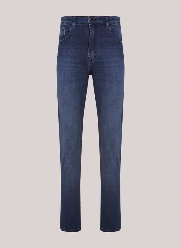 Confeccionada em jeans, a Calça possui modelagem slim fit, cós com passantes, bolsos frontais e posteriores, fechamento frontal por zíper e botão, etiqueta externa aplicada e acabamento pespontado.