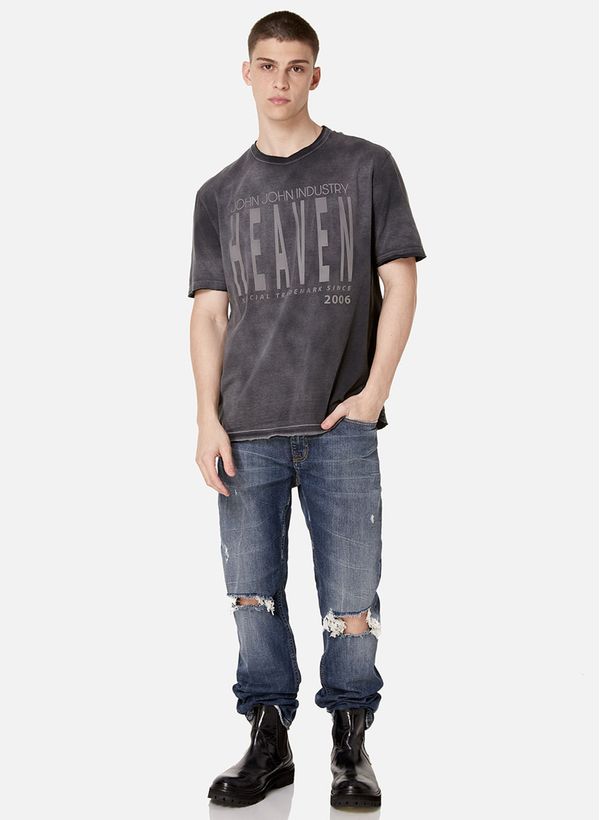 Confeccionada em jeans com elastano, a Calça Jeans possui modelagem Slim, cós com passantes para cinto, três bolsos frontais sendo um de moeda, dois posteriores, detalhes de rasgos e aviamentos em ferragem envelhecida, acabamento pespontado e fechamento frontal por zíper e botão.