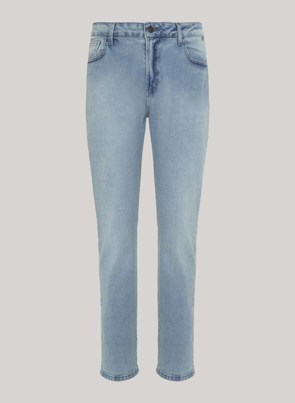 Confeccionada em jeans, a Calça possui modelagem slim fit, cós com passantes, bolsos frontais e posteriores, fechamento frontal por zíper e botão, etiqueta externa aplicada e acabamento pespontado.