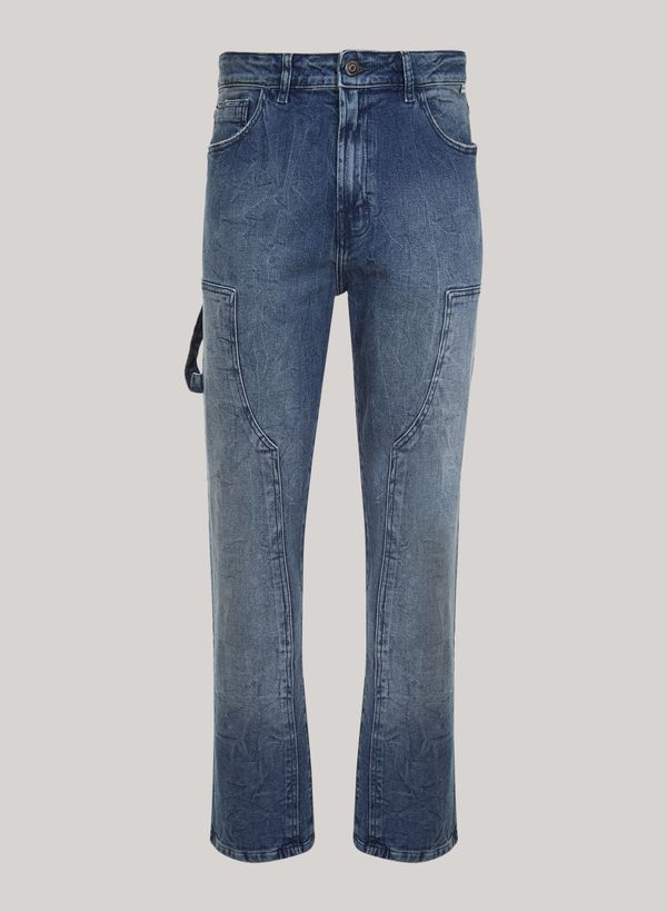 Confeccionada em jeans, a Calça possui modelagem straight, cós com passantes, bolsos frontais e posteriores, detalhe de tira aplicada na parte de trás, fechamento frontal por zíper e botão e acabamento pespontado.