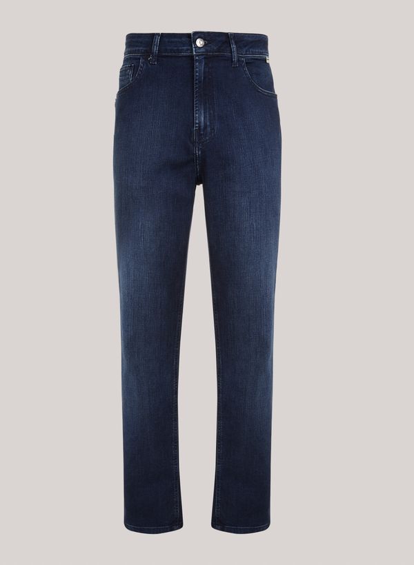 Confeccionada em jeans, a Calça possui modelagem straight, cós com passantes, cinco bolsos, fechamento frontal por zíper e botão, etiqueta externa aplicada e acabamento pespontado.