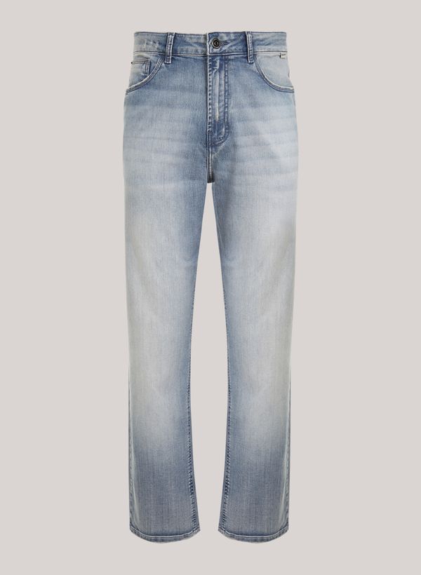 Confeccionada em jeans, a Calça possui modelagem straight, cós com passantes, cinco bolsos, etiqueta externa aplicada, fechamento frontal por zíper e botão e acabamento pespontado.