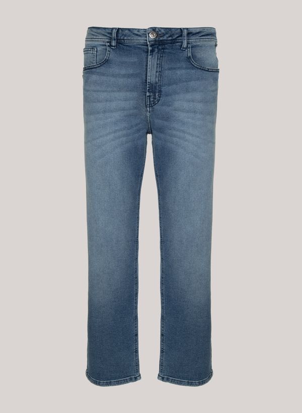 Confeccionada em jeans, a Calça possui modelagem straight, cós com passantes, bolsos frontais e posteriores, fechamento frontal por zíper e botão, etiqueta externa aplicada e acabamento pespontado.