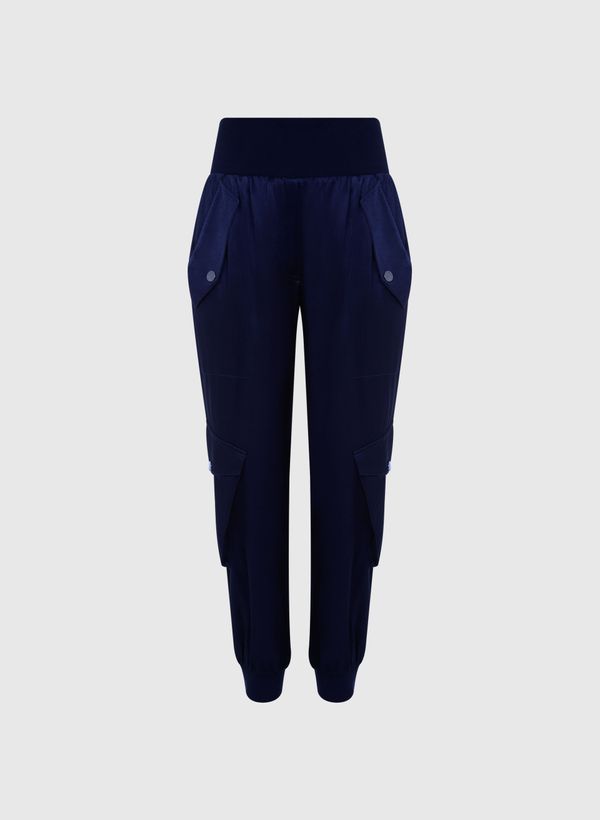 A Calça é confeccionada em tecido plano, possui modelagem em alfaiataria, modelo cargo, cós alto, bolsos modelo faca com lapela, bolsos laterais amplos com lapelas e bolsos posteriores com lapelas e acabamento pespontado.