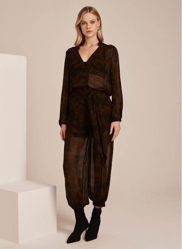 A Calça é confeccionada em tecido fluido telado com estampa, possui transparência, modelagem jogger, cós com elástico posterior, faixa para amarração, quatro bolsos,forro curto interno, barra com elástico e acabamento pespontado.