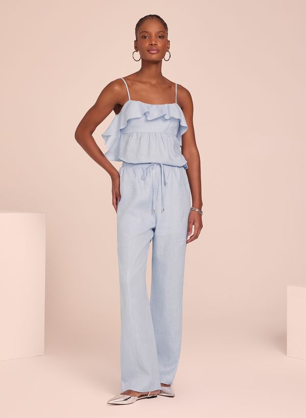 Confeccionada em tecido plano, a calça possui modelagem reta e soltinha. Possui cós com elástico embutido e ajuste por amarração com ponteiras metálicas. Os pespontos são sutis, reforçando a estrutura da peça sem comprometer sua aparência minimalista e acabamento limpo nas barras.