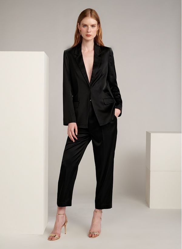 Peça essencial no guarda roupa universal, a calça preta de alfaiataria é versátil e atemporal. Use a Calça Anastacia formando o twin set com o blazer da mesma coleção, acessórios poderosos e sandália de salto alto, para um visual elegante e trendychic.