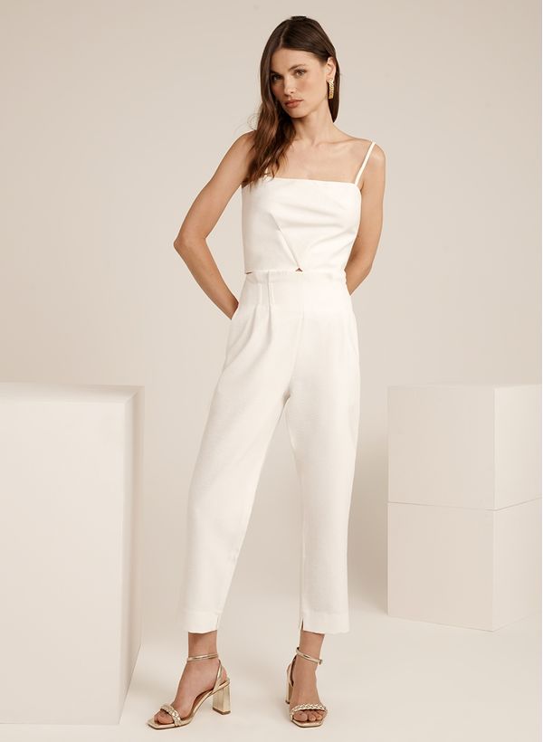 A Calça é confeccionada em tecido plano, possui modelagem alfaiataria, bolsos frontais e posteriores e acabamento pespontado.