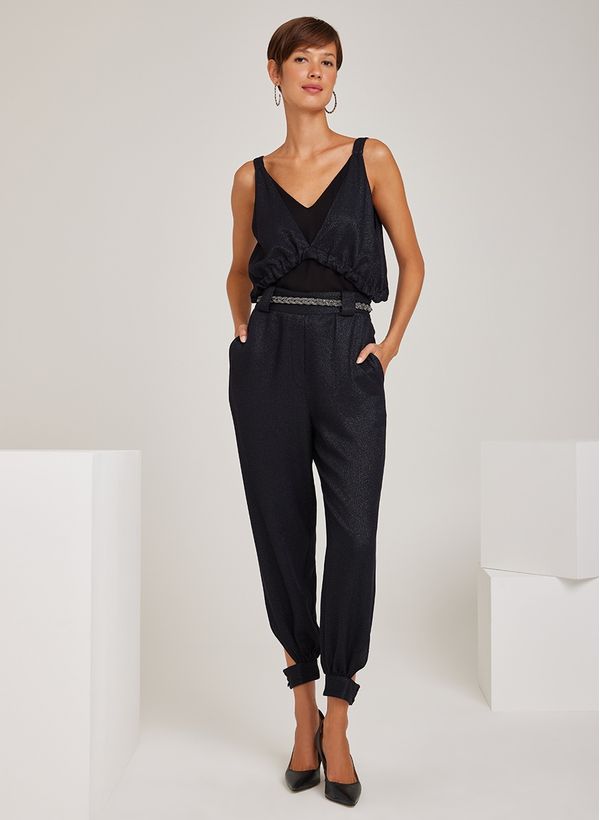 A Calça é confeccionada em tecido plano, possui aplicação de brilhos, cós com passantes, bolso frontais, fechamento lateral por zíper invisível e barra com recorte vazado e fechamento de botões.