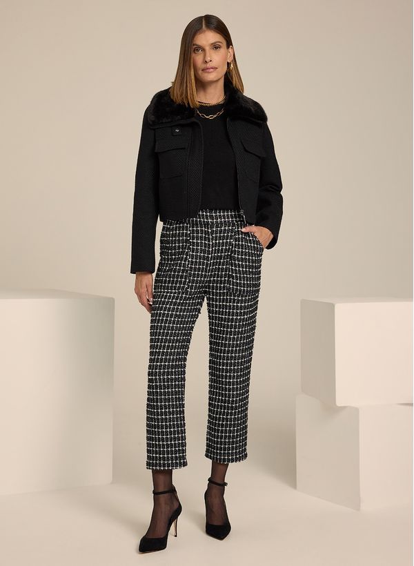 A Calça é confeccionada em malha com fios metálicos, possui padronagem xadrez, cós aplicados, bolsos frontais, fechamento lateral por zíper invisível e acabamento pespontado.