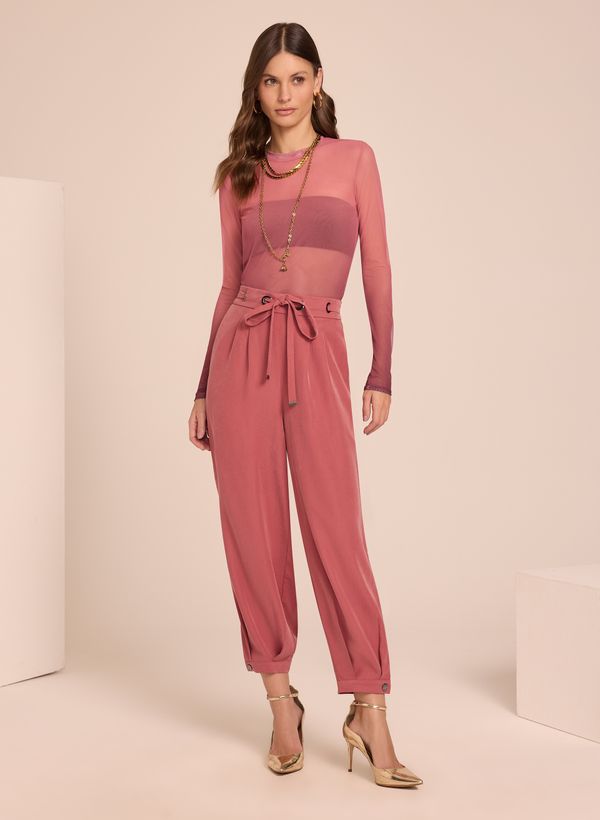A Calça é confeccionada em tecido plano, possui modelagem ampla, cós com elástico e cinto aplicado, bolsos frontais, barra com botões e acabamento pespomntado.