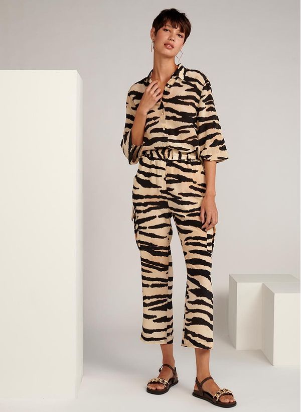 Confeccionada em seda, a Calça possui padronagem animal print, modelagem bootcut, cós com passantes, cinto com faixa ajustável, fechamento frontal por zíper e fecho, quatro bolsos, comprimento crooped e acabamento pespontado.