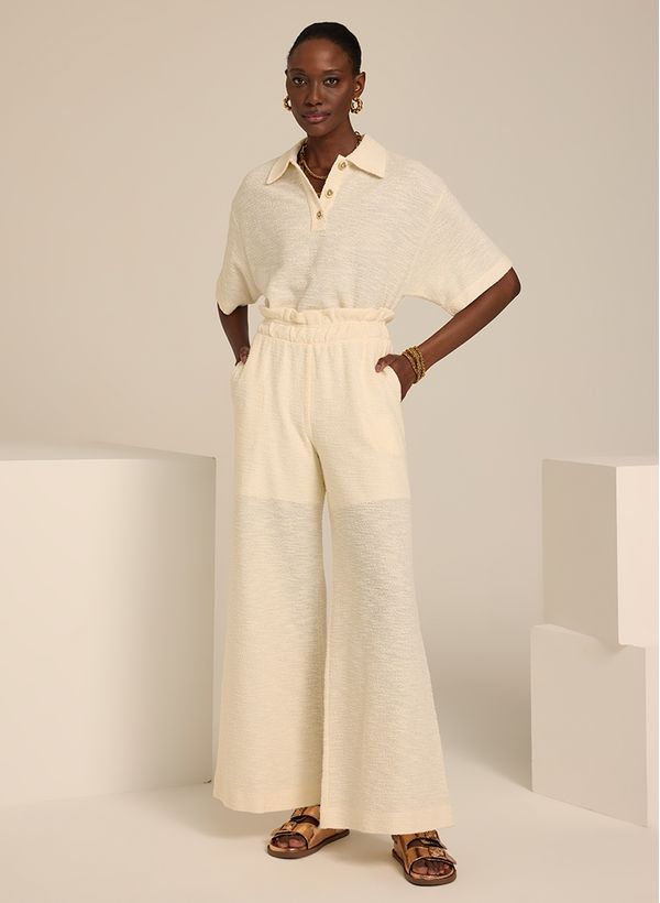 A Calça é confeccionada em malha, possui modelagem pantalona, cós aplicado, bolsos frontais e acabamento pespontado.