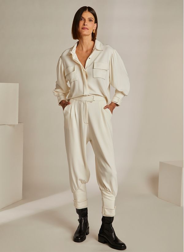 Estilosa e autêntica, a Calça Dede é uma ótima escolha para produzir diversos looks. Invista no mood comfy combinando com a blusa da mesma coleção, acessórios metalizados e botas chelsea pretas para arrematar.