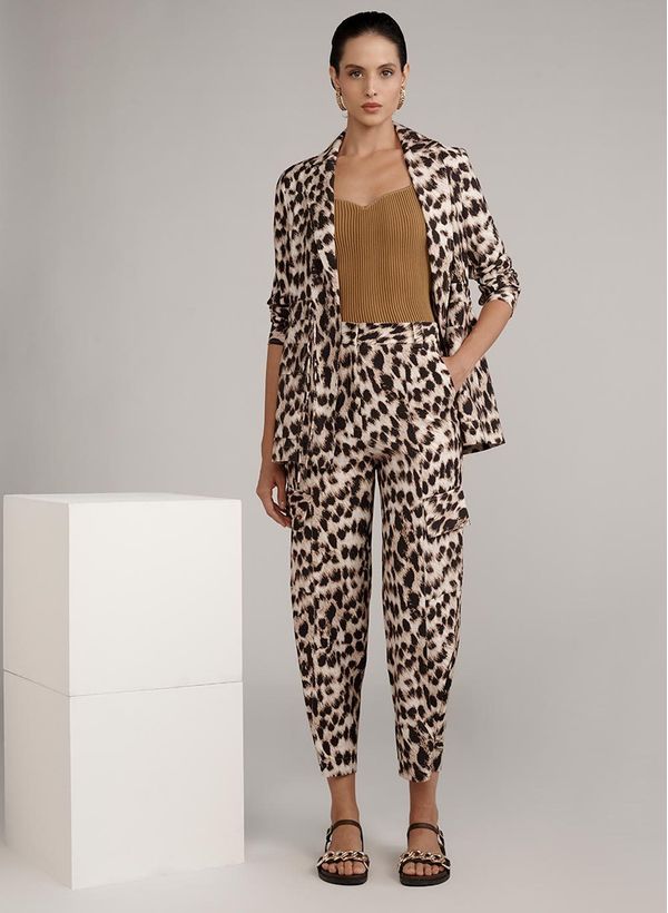 Confeccionada em tecido plano, a Calça possui padronagem animal print, modelagem cenoura, cós com passantes, fechamento por fecho invisível e zíper, bolsos frontais e laterais com lapelas, barra com martingales e acabamento pespontado.