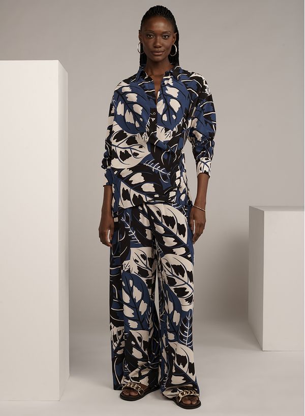 A Calça é confeccionada em tecido plano com estampa de folhas, possui modelagem pantalona, cintura alta, bolsos frontais e posteriores, pregas frontais, fechamento frontal por zíper invisível e acabamento pespontado.