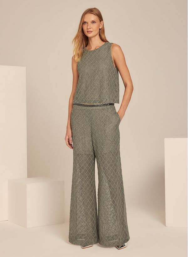 A Calça é confeccionada em malha texturizada em alto relevo com padronagem geométrica, possui transparência, caimento reto, cós aplicado, dois bolsos frontais, forro embutido e acabamento pespontado.