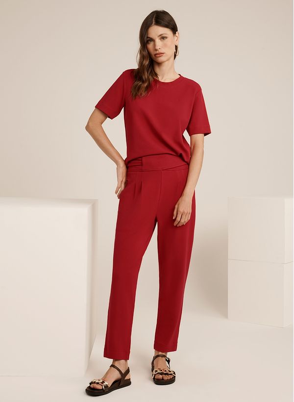 A Calça é confeccionada em malha, possui cintura alta, cós aplicado, bolsos frontais e posteriores e acabamento pespontado.