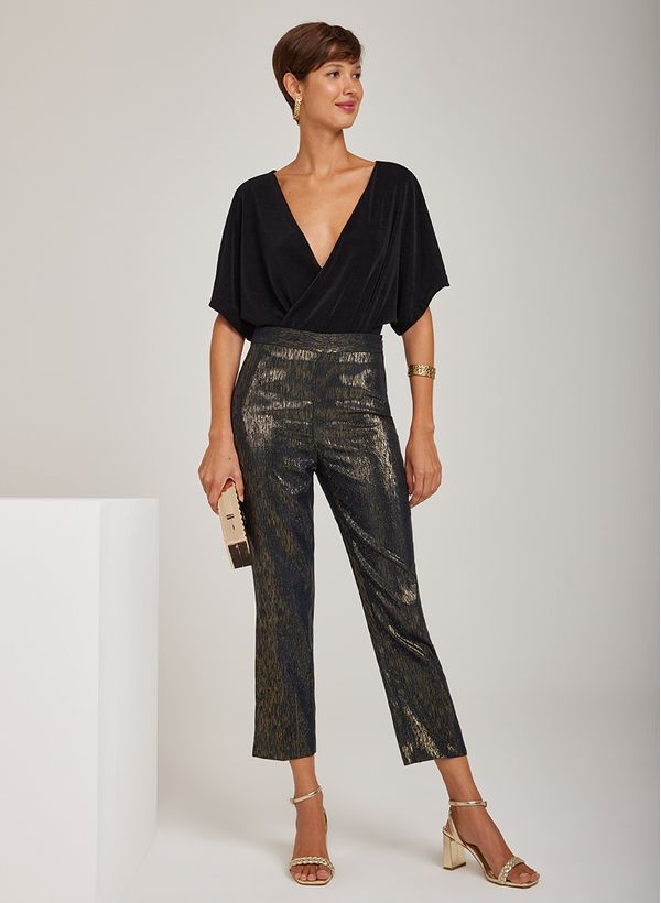 A Calça é confeccionada em tecido plano com fios de lurex com efeito dourado, possui modelagem em alfaiataria, caimento reto, bolsos posteriores e fechamento lateral por zíper invisível.