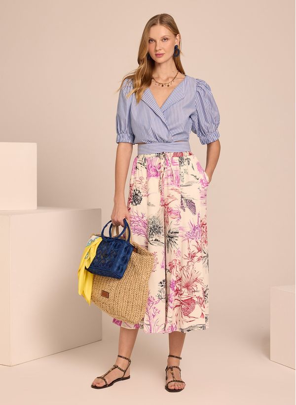 A Calça é confeccionada em tecido fluido estampado, possui modelagem pantalona, cós com elástico e cordão, dois bolsos e acabamento pespontado.