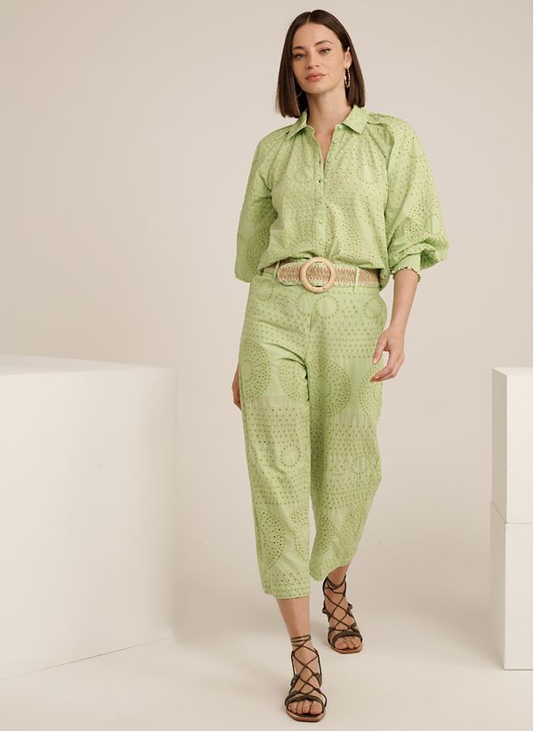 Aposte nas peças em laise para garantir uma composição cheia de charme e a cara do verão. Monte o conjunto combinando a Calça Joy com camisa da mesma coleção, complete o look com sandálias flats e acessórios.