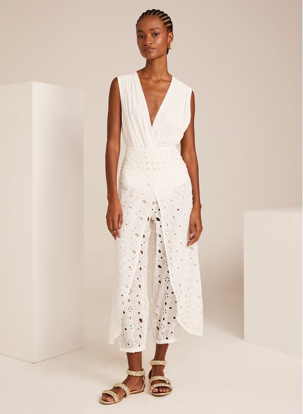 A Calça é confeccionada em laise, possui transparência, cós aplicado largo com detalhes espelhados, saia sobreposta com fenda frontal e fechamento lateral por zíper invisível.