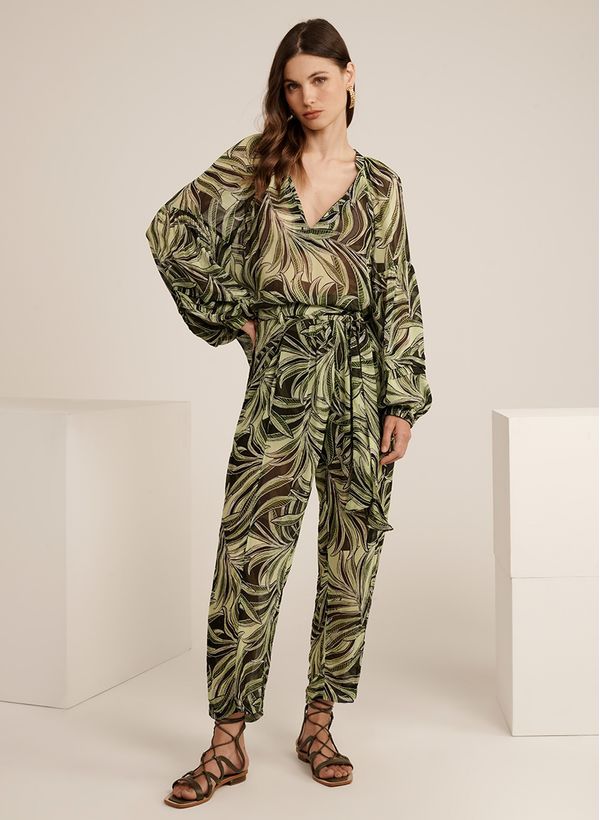 A Calça é confeccionada em tecido leve e fluido com estampa de folhagens, possui modelagem cenoura, cós com passantes e faixa, bolsos e pregas frontais, acabamento pespontado.