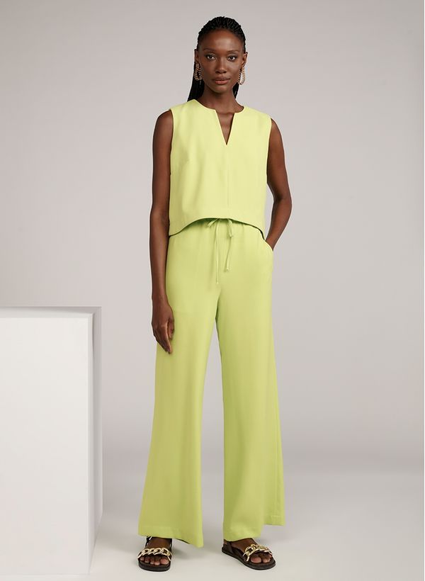 Confeccionada em tecido plano, a Calça possui modelo pantalona, cós com elástico e cordão para amarração, bolsos frontais modelo faca e acabamento pespontado.