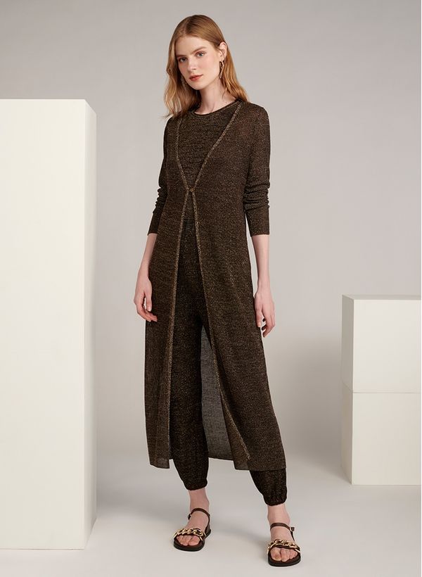 A Calça Lia deixa o seu look mais interessante com toque de brilho e a textura do tricot. Experimente o visual monocromático com a regata e o casaco da mesma coleção para um visual contemporâneo chic, adicionando acessórios e papetes para arrematar.