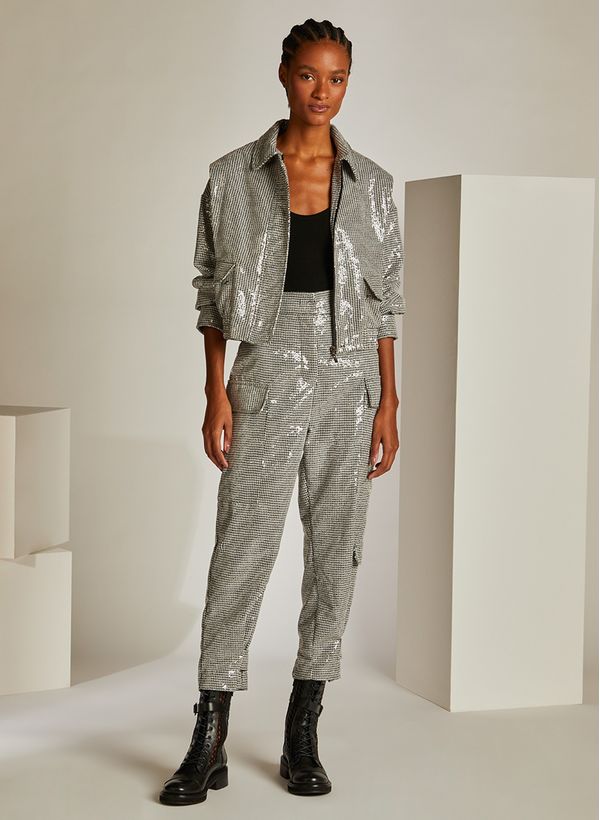 Confeccionada em tecido plano, a Calça possui bordados de paetê e padronagem pied de poule, cintura alta, cós largo com martingales, fechamento frontal por zíper e fecho invisível, cinco bolsos, martingales nas barras e acabamento pespontado.