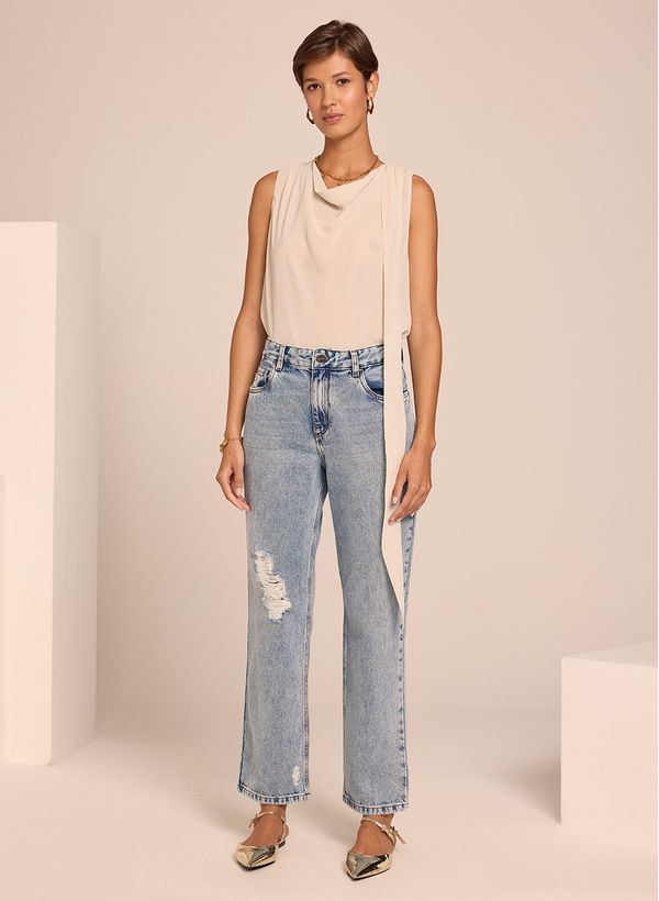 A Calça é confeccionada em Jeans, possui lavagem claro, modelagem reta, cós com passantes, cinco bolsos, detalhes emdestroyed, fechamento frontal por zíper e botão e acabamento pespontado.