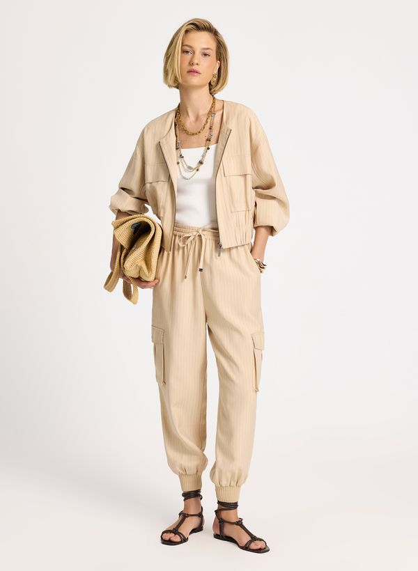 Confeccionada em tecido plano, a Calça possui modelagem jogger, padronagem listrada, cintura alta com cós elástico e ajuste por cordão com ponteiras metálicas, bolsos utilitários com lapela, punhos em malha canelada e acabamento pespontado.