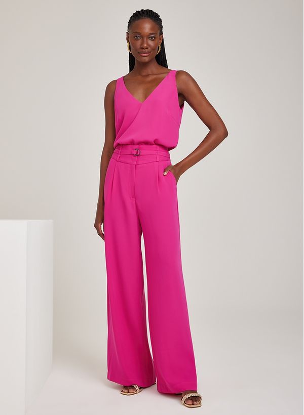Para deixa sua produção elegante e chic em instantes, aposte em peças de tecido plano. Use a Calça Nana com acessórios dourados, regata rosa e finalize a produção com sandálias, para um visual all pink poderoso.