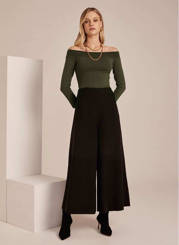 A Calça é confeccionada em tecido plano, possui modelagem pantacourt, botões aplicados, fechamento posterior por zíper invisível e acabamento pespontado.