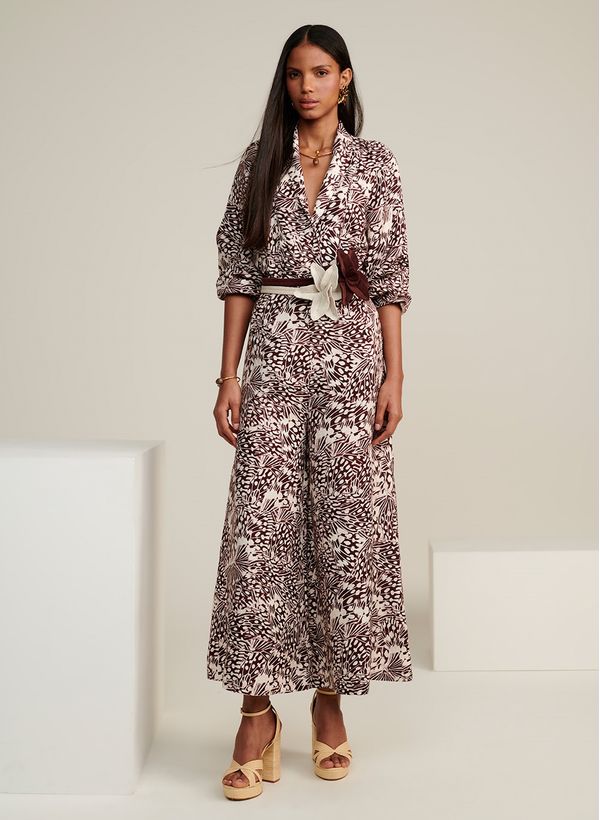 A Calça é confeccionada tecido plano estampado com toque de linho, possui modelagem pantacourt, cós largo com botões revestidos, fechamento posterior por zíper e acabamento pespontado.