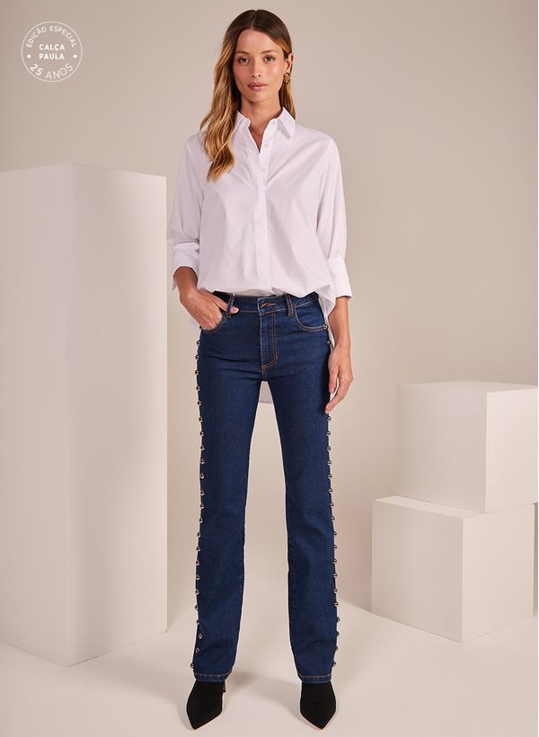 A Calça é confeccionada em Jeans, possui lavagem escura, caimento reto, cós com passantes, cinco bolsos, broches aplicados, fechamento frontal por zíper e botão e acabamento pespontado.