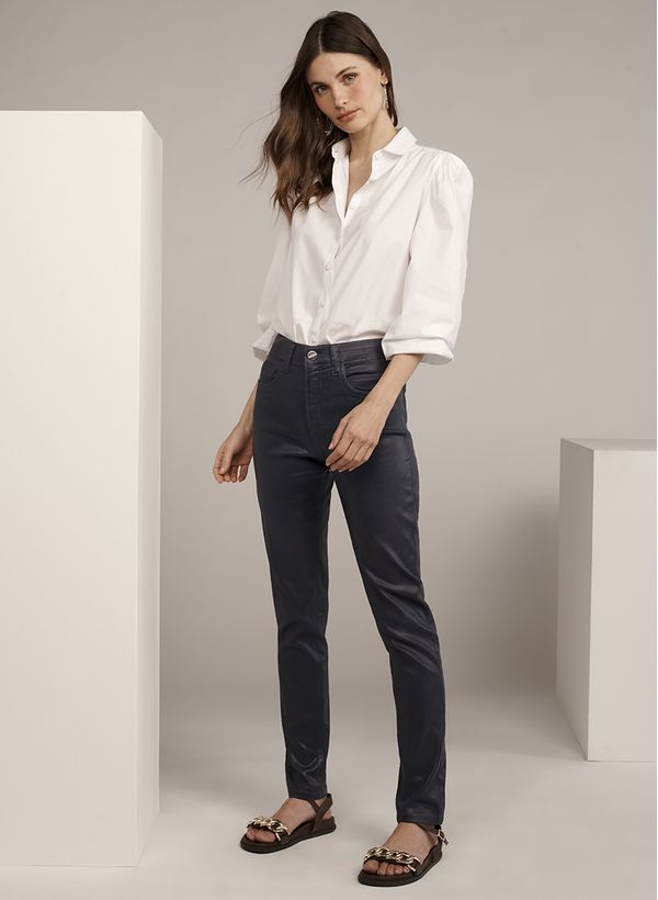 A Calça é confeccionada em sarja com efeito resinado, possui modelagem skinny com caimento ajustado, cós com passantes, fechamento frontal por zíper e botão, cinco bolsos e acabamento pespontado.