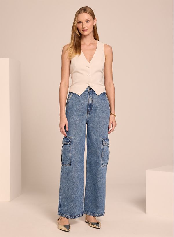 A Calça é confeccionada em Jeans, possui lavagem média, modelo cargo, cós com passantes, bolsos frontais e posteriores, bolsos laterais amplos com lapela, fechamento frontal por zíper e botão e acabamento pespontado.