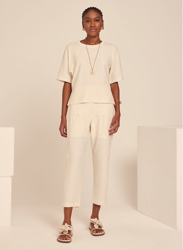 A Calça é confeccionada em malha, possui caimento reto, cós aplicado com elástico posterior, dois bolsos posteriores, barra cropped e acabamento pespontado.