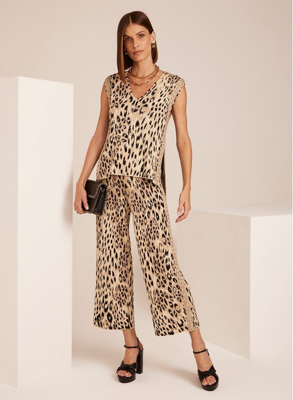 A Calça é confeccionada em tricot, possui padronagem animal print, modelagem pantalona, cós largo e acabamento canelado.