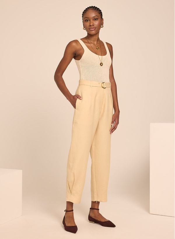 A Calça é confeccionada em tecido plano com toque de linho, possui modelagem reta, cós com passantes e cinto regulável, fechamento frontal por zíper, quatro bolsos, barra com pregas e zíper nas laterais. A peça acompanha cinto do mesmo tecido.