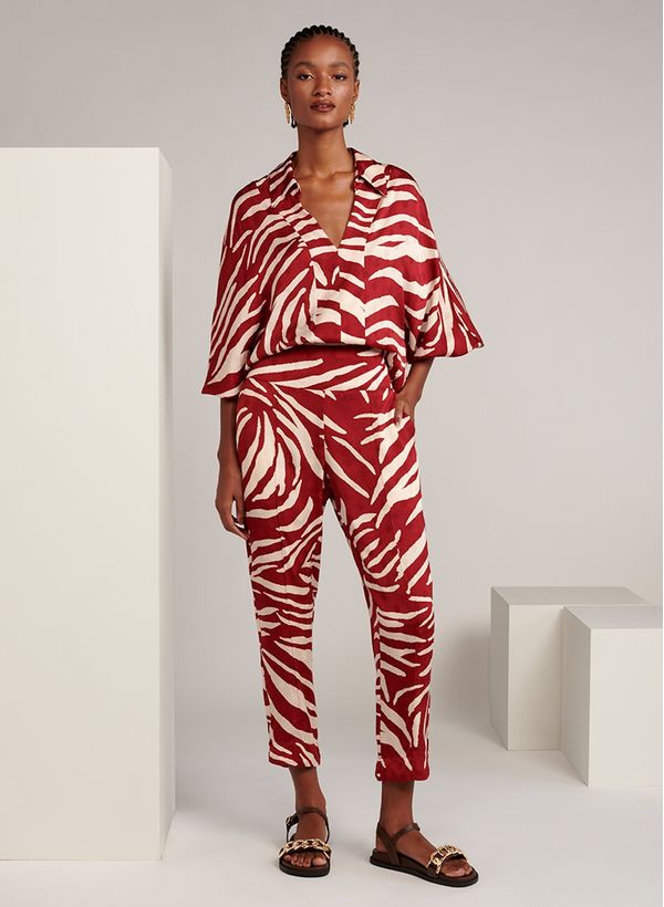 Confeccionada em tecido fluido, a Calça possui padronagem animal print, modelagem reta, cós largo, dois bolsos frontais modelo faca, comprimento cropped e acabamento pespontado.