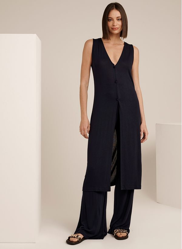 A Calça é confeccionada em malha, possui caimento reto, cós aplicado e acabamento pespontado.