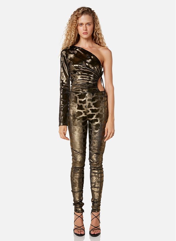 Confeccionada em malha metalizada, a Calça possui modelagem justa ao corpo, detalhe de abertura lateral na barra por zíper invisíverl e fecho posterior por zíper.