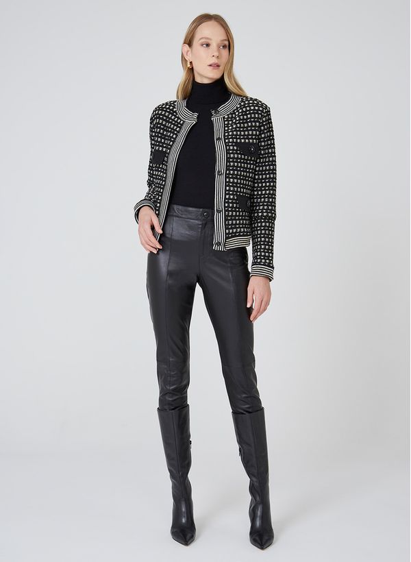 Confeccionada em couro, a Legging possui caimento ajustado, tecido de malha posterior, fechamento frontal por zíper e botão e acabamento pespontado.