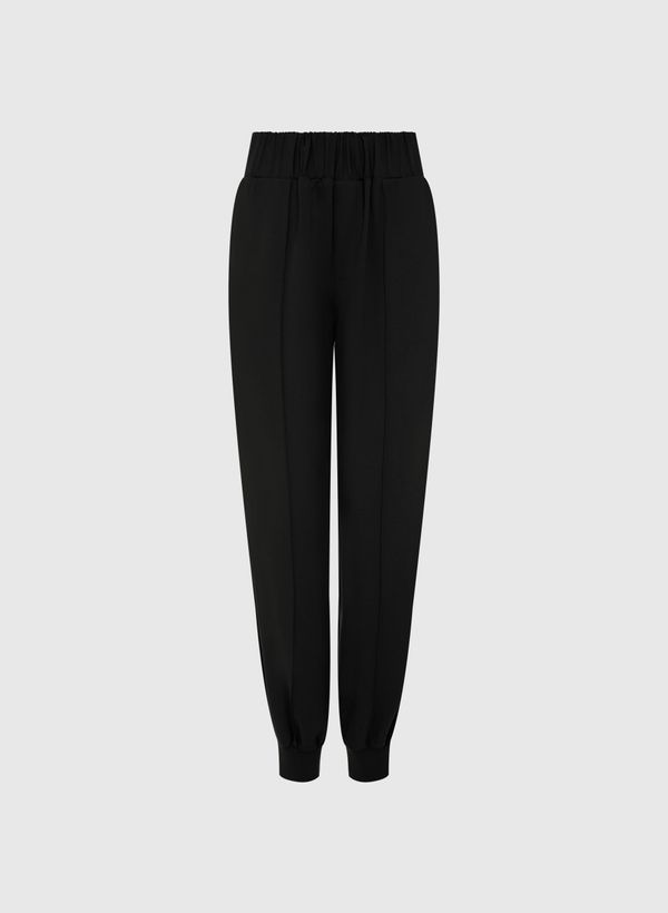A Calça é confeccionada em tecido plano, possui modelagem em alfaiataria, caimento reto, cós aplicado, dois bolsos frontais modelo faca, barra de elástico aplicado e acabamento pespontado.