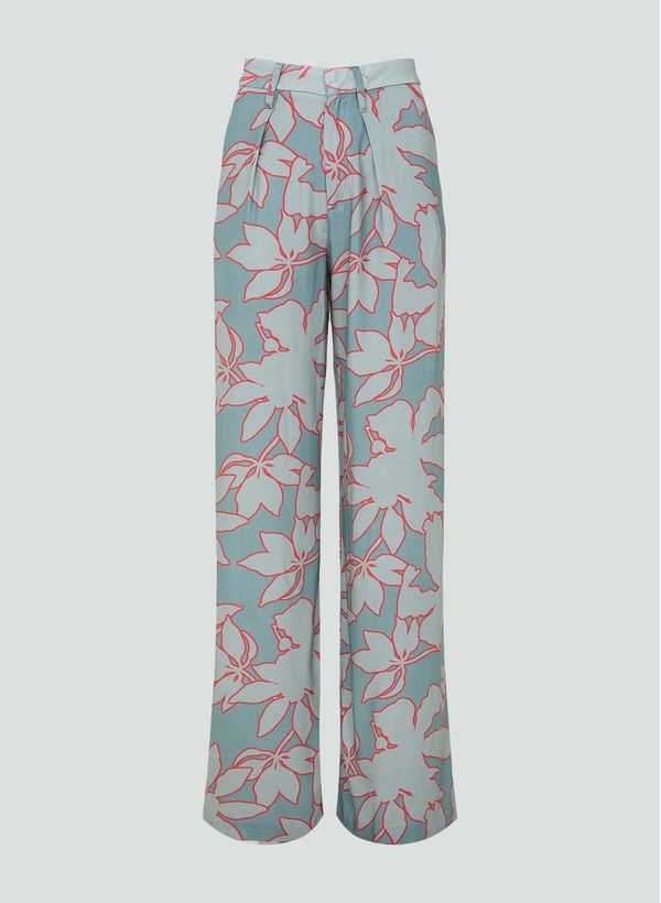 Confeccionada em tecido plano estampado, a calça possui modelagem pantalona, cintura alta, cós com passantes, fechamento frontal por fecho e zíper e acabamento pespontado.