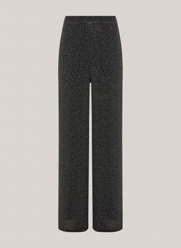 confeccionada em malha, a Calça possui modelagem pantalona, cós alto com elástico, brilho aplicado por toda a peça e acabamento pespontado.