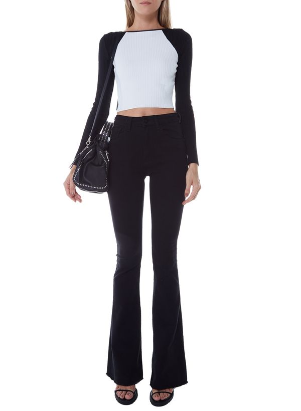 A Calça é confeccionada em sarja com tingimento preto, possui modelo flare, cós com passantes, fechamento por botão e zíper frontal, cinco bolsos, barra corte a fio e acabamento pespontado.