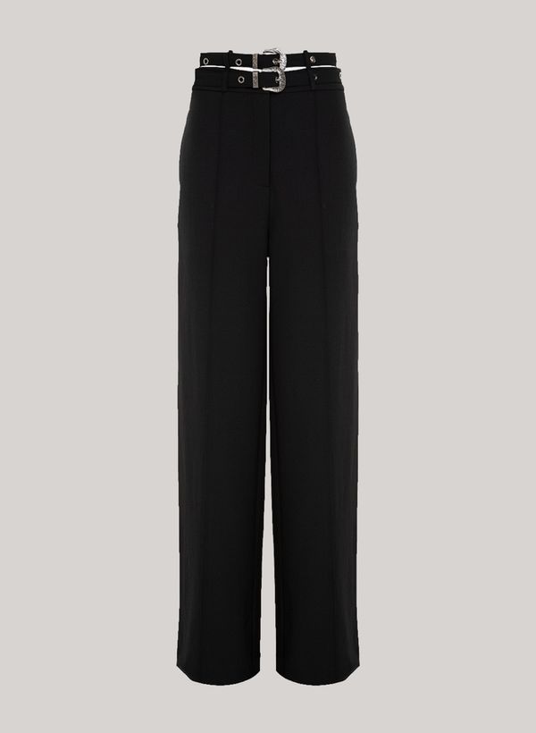 Confeccionada em tecido plano, a Calça possui modelagem reta, cós com passantes e detalhe de cintos duplos aplicados, bolsos frontais e posteriores, fechamento frontal por zíper e acabamento pespontado.